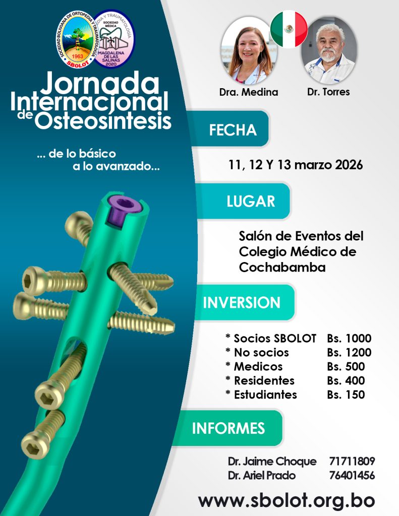 La Sociedad Boliviana de Ortopedia y Traumatología filial Cochabamba tienen el agrado de invitarlos a la Jornada Internacional de Osteosíntesis, de lo básico a lo avanzado, donde se tendrá invitados Internacionales y Nacionales referentes en el ámbito académico y profesional con temas de interés actual.